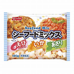 A=「シーフードミックス」エビ、イカ、アサリが入ったシーフードミックス。カレー、パスタ、チャーハンなどのメニューに幅広く使える。