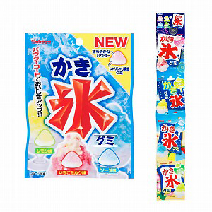 A=「かき氷グミ」夏の風物詩・かき氷を、見た目、食感ともにイメージしたグミキャンデー。氷のようにシャリシャリとした結晶グミにパウダーコートを施し、よりかき氷らしさがアップ。味は〈いちごミルク味〉〈レモン味〉〈ソーダ味〉の3種類。〈メロン味〉を加えた4つの味が楽しめる連包タイプ(4袋)もある。