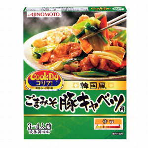A=〈韓国風ごまみそ豚キャベツ用〉シリーズ新アイテム。3種のごま(練りごま、すりごま、切りごま)と味噌のコクが特徴。甘口なので、小さな子どもから大人まで楽しめる。
