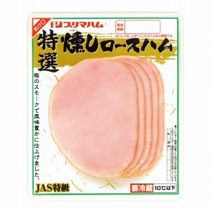A=「特選 燻しロースハム」肉のコクとうまみを引き出したJAS特級のロースハム。桜のチップでいぶした。