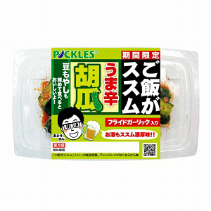 A=〈うま辛胡瓜〉シリーズ新アイテム。期間限定。旬のキュウリと濃厚甘うまだれが絡んだ豆モヤシを、しっかりキムチ漬けした。フライドガーリックを加えて、香ばしさとうまみをアップ。
