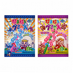 ◆商品特徴=菓子。新シリーズ。粉2種、トッピング、プラスチックパーツ(木・枝)、トレーのセット。粉と水をまぜ合わせた液体に、プラスチックのパーツで組み立てた“木”を浸し、もう1つの粉に付けながらクルクル回すと丸いグミの実が出来上がる。液と粉を付ける動作を繰り返すほど、大きなグミの実がなる。出来上がったグミの実に、トッピングを振りかけて食べる。