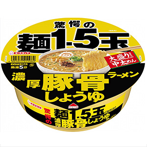 ◆商品特徴=麺類。シリーズ新アイテム。適度な弾力とコシのあるノンフライ丸麺。大盛り1.5玉分使用。湯戻し5分。醤油ベースにポークのうまみと豚脂のコクを加えたスープ。アクセントにニンニク、ショウガを利かせて濃厚スープのうまみを一層引き立て、最後まで飽きのこない味。かやくは、味付け肉そぼろ、メンマ、なると、ネギ。