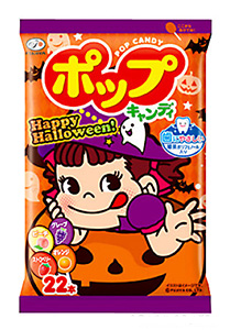 A=「ハロウィン ポップキャンディ」グレープ、ストロベリー、オレンジ、ピーチの4種類の味。ペコちゃんが魔女の仮装をしたパッケージデザイン。