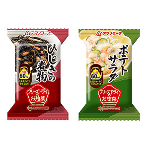 ◆商品特徴=調理品。60mlの湯を注ぐと30秒で出来上がる簡単、便利なフリーズドライ食品。〈ひじきの煮物〉と〈ポテトサラダ〉の1人分の惣菜が、2食ずつ入ったセット。〈ひじきの煮物〉は、油揚げと彩りのよいニンジンを使い、かつおだしを利かせた。〈ポテトサラダ〉は、食感を残したジャガイモに、キュウリ、ツナ、ニンジンを合わせ、オリーブオイルを加えて滑らかな食感。毎日の食卓に一品加えたい時や弁当のおかずとしても便利で、家庭の備蓄食にも利用出来る。