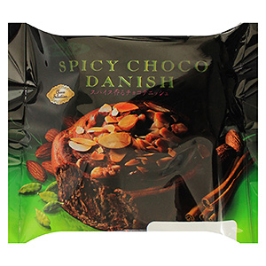 A=「スパイス香るチョコデニッシュ」チョコシートを折り込んだ生地で、シナモン、ナツメグ、カルダモンを配合したチョコケーキ生地を巻き込み、アーモンドとクルミをトッピングした。