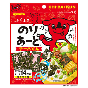 ◆商品特徴=加工水産。シリーズ第15弾商品。千葉県PRマスコットキャラクターの“チーバくん”の形をした海苔。デザインは全7種。カットされているので、弁当やおにぎり、料理を簡単に楽しく演出する。