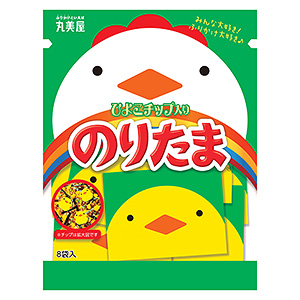 A=「期間限定 ひよこチップ入りのりたま」ひよこ型チップ入り。親鳥の外袋、ヒヨコの内袋のイラストをデザイン。