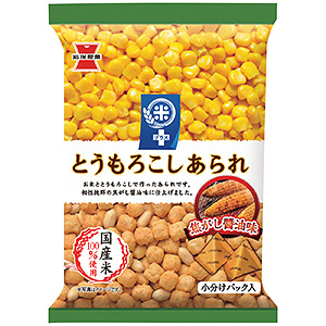 A=〈とうもろこしあられ焦がし醤油味〉生地にトウモロコシパウダーを練り込んだ。