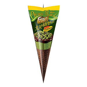 A=「ジャイアントコーン〈大人の抹茶生チョコ〉」抹茶クッキーとチョコレートをトッピングし、抹茶生チョコレートが側面に入った抹茶アイスとココアワッフルコーンを組み合わせた。宇治抹茶を使用し、香り高く深い味。