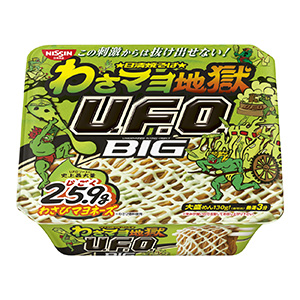 ◆商品特徴=麺類。シリーズ新アイテム。ソースとの絡みがよい中太麺。麺大盛りタイプ。ソースは濃厚な香りと豚肉を炒めたうまみやコクが特徴の“病みつき濃厚エクストリームソース”。具材は、キャベツ。ツンとくるわさびの香りがクセになる、“わさびマヨネーズ”U.F.O.史上最大量の25.9g。麺を覆い尽くすほどのわさびマヨネーズが、病みつき濃厚エクストリームソースと合わさり、これまでにない刺激的な味。