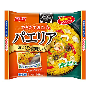◆商品特徴=冷凍食品。シリーズ新アイテム。5種の具材(エビ、アサリ、イカ、赤パプリカ、ブラックオリーブ)を使った、魚介のうまみと彩り豊かなパエリア。電子レンジであたためるとおこげができる、こんがりおこげシート入り。トレーのまま食べられる。