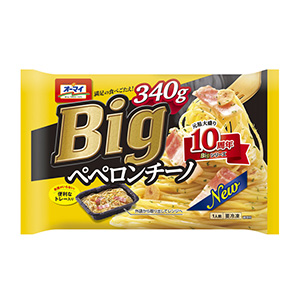 A=「オーマイ Big〈ペペロンチーノ〉」ニンニク、オリーブオイル、唐辛子の風味がしっかり感じられる本格的な味。べーコン、フライドガーリック、パセリ入り。大盛りタイプ、トレー入り。