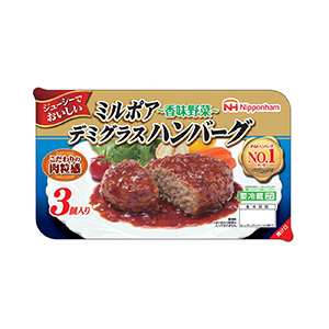 ◆商品特徴=惣菜類。リニューアル。しっかりとした肉粒感にこだわり、ジューシーに焼き上げたハンバーグ。ソースはミルポア(香味野菜)をベースにしたデミグラスソース。