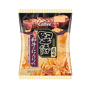 A=「堅あげポテト匠味〈和牛とにんにく味〉」和の味付けのポテトチップス。塩で味付けしたシンプルな和牛ステーキのうまみと、ニンニクの香ばしい風味がかむほどに広がる。