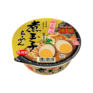 ◆商品特徴=麺類。シリーズ新アイテム。期間限定。レトルトの味付け卵が1個分入った。表面はつるつる、中はもちもちとした食感で、時間がたっても伸びにくいノンフライ麺。超特選濃口醤油をベースに、白湯系のポークエキスを配合した醤油と豚骨のバランスのよいスープ。ガーリックペーストとガーリック風味のオイルを配合した。具材はメンマ、ネギ、焼海苔、レトルト卵。