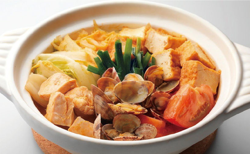 (2)鍋にAを入れて火にかけ、沸騰したら(1)の鶏肉・あさり・白菜・にら・厚揚げを加えてフタをして煮る。あさりの殻が開いたら(1)のトマトを加える。