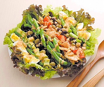 (1)スナックえんどう、いんげん、アスパラガスは彩りよく茹でておく。