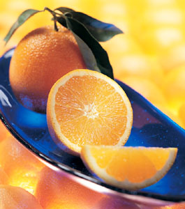 ビタミンの一種である葉酸、ビタミンC、カリウムを含むオレンジ。薄皮も一緒に食べると、さらに食物繊維、ビタミンP、ペクチンを取ることができる。5月いっぱい楽しめるネーブルは、英語で「へそ」の意味。ネーミングのもと、おしりのくぼみから皮をむかなくても芳香を放つ。甘みと酸味のバランスが良く、皮が向きやすく、薄皮も薄くて種もないので、そのまま食べるのにピッタリ。ジュースにする場合は、長時間おくと苦みが出ることもあるので、しぼったらすぐ飲むか、ラップして冷蔵庫に入れる。料理には最後の仕上げの5分で火を通すのがポイント。これから7月までが最盛期のバレンシアオレンジは、甘みが強く香りが豊かで果汁も豊富。ジュースにも向いて、しぼったまま一晩冷蔵庫においても風味やビタミンCが損なわれることはない。加熱調理にも向く。