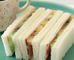 (2)パンを8枚並べ、両面にクリームチーズをぬり、キウイをたっぷり、その上にハムをのせてはさむ。食べやすい大きさに切ってできあがり。