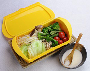 (2)(1)とその他のすべての野菜類をシリコーンスチーマーに盛り付け※、酒をふりかけてフタをし、電子レンジ(600W)で4分加熱する。