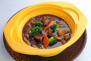 (2)「TVビーフシチュー」をシリコーンスチーマーに入れて、お湯でとく。