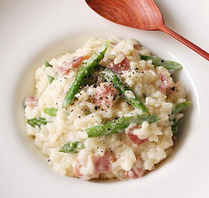 (1)アスパラガスは根元のかたい部分を少々切り落とし、斜め切りにする。ベーコンは1cm幅に切る。たまねぎはみじん切りにする。