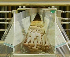 菌掻によって刺激を与えられたビンは、きのこの芽をつくる環境の部屋、芽だし室に移動されます。そこで発芽、背丈をそろえています。そして生育室へ。きのこがもっとも育ちやすい自然環境そっくりのこの部屋で、きのこはぐんぐん生育します。酸素、温度、湿度、光がコントロールされているので、背丈、品質のそろったきのこになるのです。