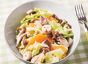 (5)ボウルに★の材料と、残ったオレンジの薄皮を絞った汁をすべて合わせドレッシングを作り、きのこ、キャベツ、オレンジを入れてまぜる。