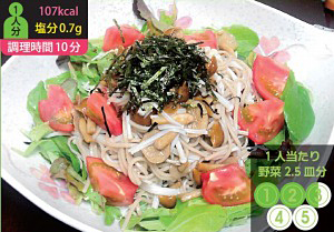 (3)(2)に(1)を盛り付け、お好みで刻みのりをのせドレッシングをかけてできあがり。