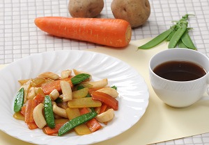 (4)フライパンにサラダ油を熱し、にんじんを入れて炒め、しんなりしてきたら、じゃがいもを加えて炒める。じゃがいもが透き通ってきたら、(3)のイカと絹さやを加えて炒め合わせ、最後にバターとしょうゆを加えて全体にからませる。