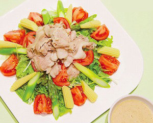 ◆黒豚とフルーツトマトのサラダ、金ごま風味