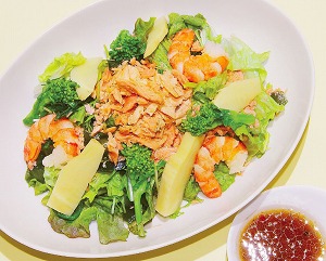 (5)(2)を皿に盛り、わかめ、海老、菜の花、たけのこを散らし、鮭をのせ、最後に刻みのりを飾る。ドレッシングを添える。