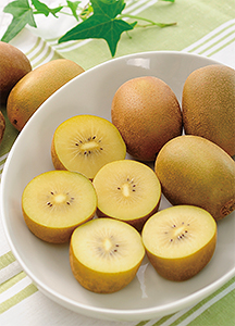 ゴールドキウイのニューフェイス、サンゴールドは、黄色い果肉、なめらかな食感、驚くほどのジューシー感が特徴。甘みだけでなく爽やかな酸味があり、やわらかくなるほど甘さがアップ。肉料理と相性が良いたんぱく質分解酵素、アクチニジンも含みます。