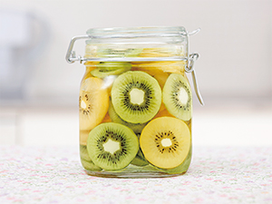 (5)キウイはそのまま(1)の漬け汁は水やお湯で割っていただく。