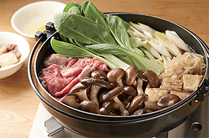 (3)鍋にAを入れ、霜降りひらたけ、チンゲン菜、焼き豆腐、しらたきを入れて火にかける。煮立ったら7、8分煮る。