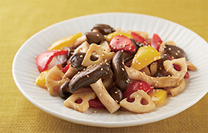(3)れんこんに火が通ったら、霜降りひらたけとパプリカを加えてさっと炒めてAを回し入れて絡め、仕上げに白ごまをふる。