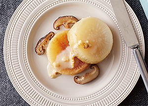(2)鍋にA、大根、しいたけを順に重ね入れて塩をふる。フタをして大根がやわらかくなるまで弱火でウォータースチームする。途中、上下を一度返す。