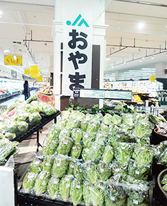 おじいちゃん・おばあちゃん、パパ・ママ、お子さまの3世代でお買い物を楽しみにいらっしゃる週末には、食品売り場のメニュー提案ブース「クッキングステーション」で、この地場野菜を使った料理を大々的に提案しています。小山にはおいしい野菜がたくさんあるので大好評。地場野菜でつくったスムージーが特に人気です。