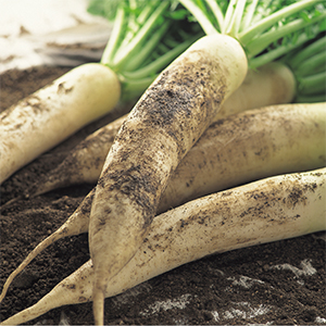 寒さがつのるにつれて味わいを増す、日本古来の冬野菜。通常食べる根の部分にはビタミンCやカリウム、でんぷんの消化を助けるアミラーゼ、焼き魚の焦げに含まれる有害物質を分解するオキシターゼなどが。これらの酵素類は加熱に弱いため、酵素を取りたい場合は生で。ビタミンCは皮に近い部分と皮に多いので、すりおろして食べる時は皮ごと。加熱すると甘みが強くなるので、自然の甘みを楽しみたい時は温めて。