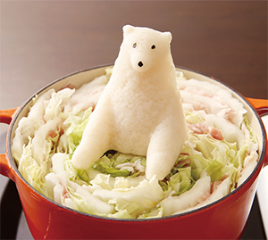(3)大根はすりおろしてザルにあけ、水気を絞り、白くまの形にする。のりは白くまの目と鼻用に丸く切って白くまの顔につける。