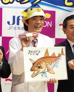 この「おさかなソーセージ」には、もうひとつ画期的な特徴があります。それは、100%国産魚でできていて、魚の履歴までしっかりと管理されていること。北海道産のスケソウダラ、島根県産のカナガシラ、エソ、レンコダイが使われています。さかなクンは、得意のイラストで原料の紹介をしてくれました。