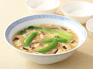 (2)鍋に水を入れ「クノールSoupDo」を加え、よくかき混ぜながら煮立て、(1)のスナップえんどうを加えて煮る。煮立ったら強火にして溶き卵を流し入れ、ひと煮立ちさせる。