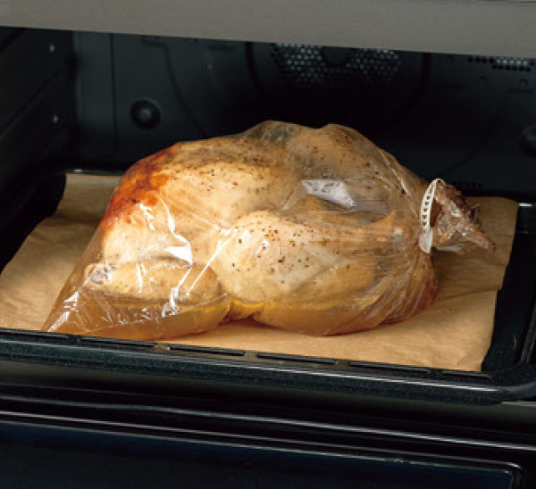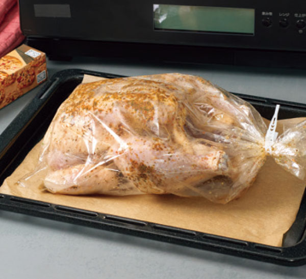 外袋からとり出したオーブンバッグをそのままオーブンへ、あとは焼き上がりを待つだけ。クリスマスのテーブルは、このごちそう自家製ローストチキンさえあれば、みんなが笑顔になること間違いなし!