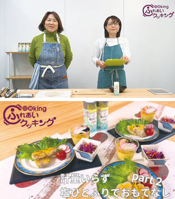 食品業界No.1専門紙である日本食糧新聞社が主催する「日食ふれあいクッキング」は、食品企業や団体とタイアップしながら、食の情報や、栄養バランスが良くおいしい料理を簡単につくるコツをお伝えしてきました。60年以上の歴史を持つ料理教室で、これまでに20万人以上の方が楽しみながら参加されています。ここでは、大好評の「塩ひとふり」を使用したレシピを3点ご紹介します。