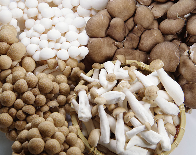何種類かのきのこを合わせると補気(気を補うこと=元気になること)の働きが強くなり、肺や胃腸の機能を高めます。しいたけ、まいたけ、ブナシメジは日光を当てるとビタミンDに変化する「エルゴステロール」が多くなり、カルシウムの吸収を助けます。ブナシメジには肝臓の働きを助ける「オルニチン」がシジミの7~10倍も入っています。