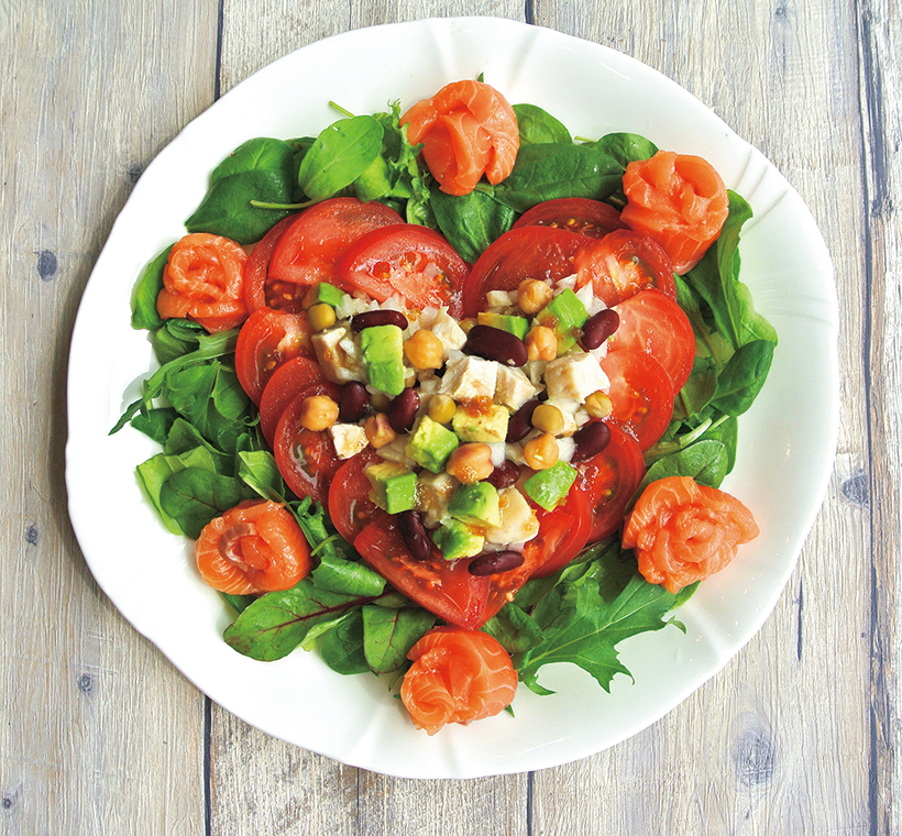 (3)器にベビーリーフを敷き、(1)をハートの形に並べ、(2)とミックスビーンズを盛りつけ、花の形に巻いたサーモンをのせ、ドレッシングをかける。