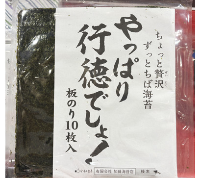 市川市と船橋市の沖に広がる三番瀬でとれた「行徳海苔」の商品を品揃え。板のり「やっぱり行徳でしょ!」はお土産にも喜ばれます