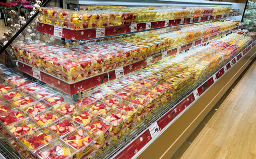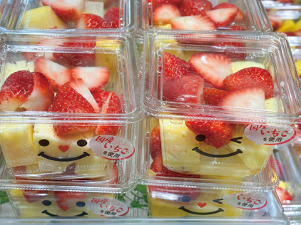 皮むき不要。手軽でおいしいカットフルーツがこの規模で並ぶのも子育てファミリーが多い同店ならでは!パイナップルと旬のフルーツのミックスや食べ比べ商品などラインナップが豊富