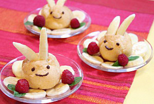 バナナは長さ10cmに切り縦4等分に(耳用)、残りは輪切りにする。シュークリームに耳用バナナを刺し、チョコで目と口を描き、輪切りバナナなどと盛り付ける。